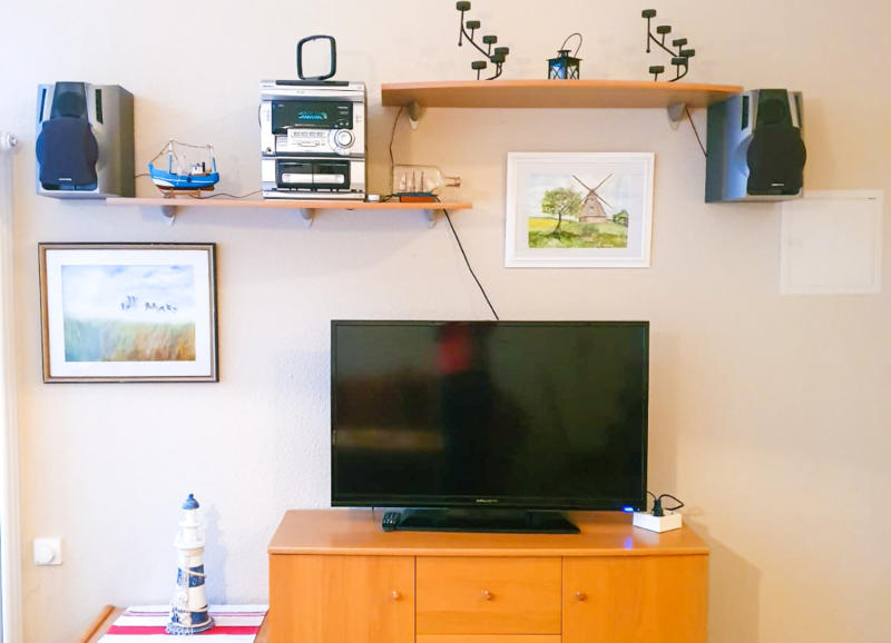 verfügt über ein Wohnzimmer mit Küchenzeile und Essecke, separates Schlafzimmer mit Fernseher, 2